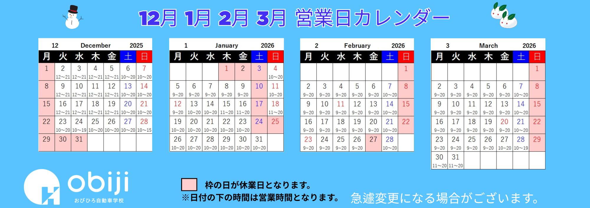 12・1・2・3月営業日